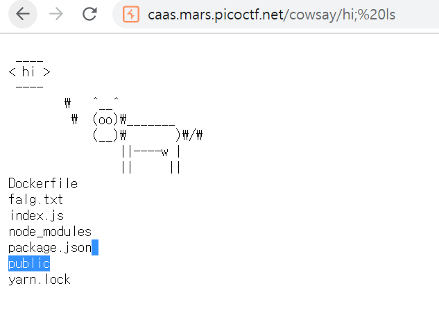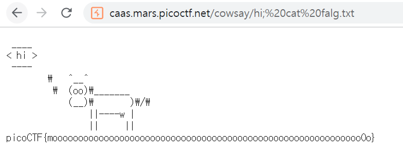 hi; ls를 입력하니까 해당 디렉토리에 존재하는 파일들을 나열해준다. falg.txt를 cat으로 읽어보자.