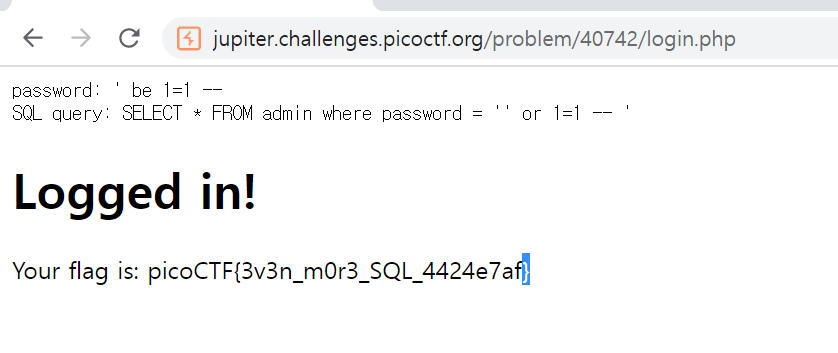 다시 원래대로 돌아오게 되는 성질이 있다. password에 입력되기에 ' or 1=1 --를 입력해야 된다.