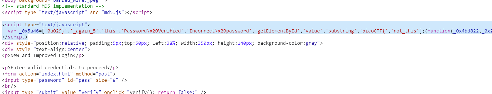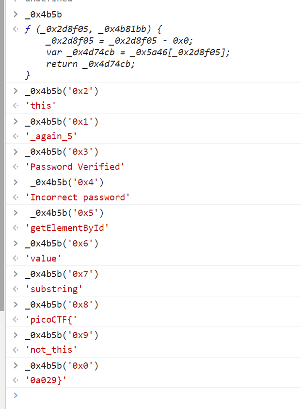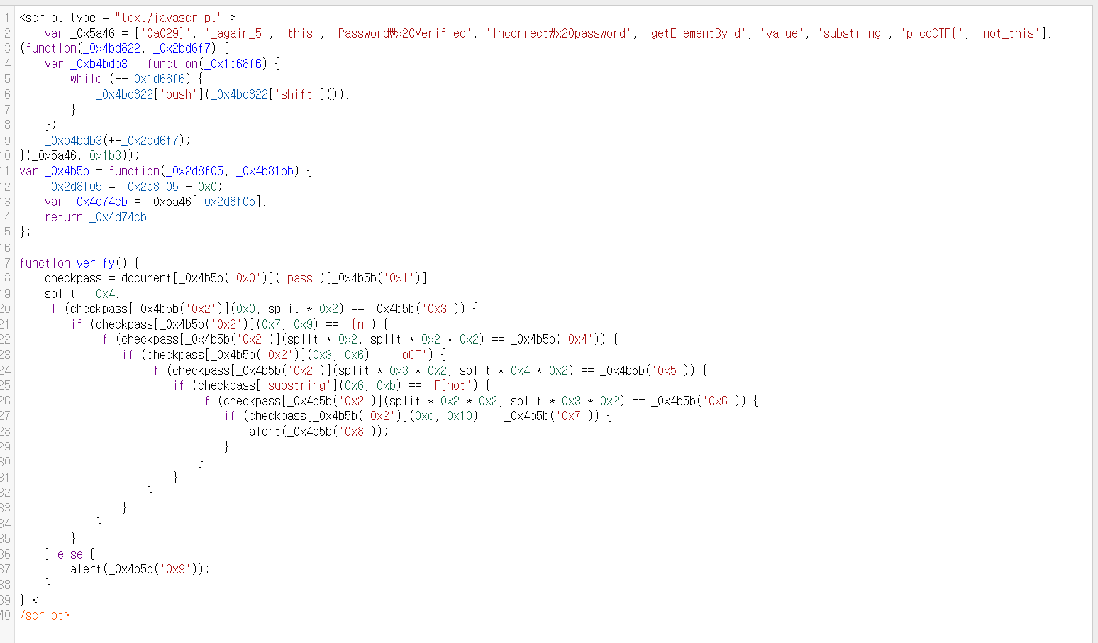 var _0x5a46=['0a029}','_again_5','this','Password\x20Verified','Incorrect\x20password','getElementById','value','substring','picoCTF{','not_this'];(function(_0x4bd822,_0x2bd6f7){var _0xb4bdb3=function(_0x1d68f6){while(--_0x1d68f6){_0x4bd822['push'](_0x4bd822['shift']());}};_0xb4bdb3(++_0x2bd6f7);}(_0x5a46,0x1b3));var _0x4b5b=function(_0x2d8f05,_0x4b81bb){_0x2d8f05=_0x2d8f05-0x0;var _0x4d74cb=_0x5a46[_0x2d8f05];return _0x4d74cb;};function verify(){checkpass=document[_0x4b5b('0x0')]('pass')[_0x4b5b('0x1')];split=0x4;if(checkpass[_0x4b5b('0x2')](0x0,split*0x2)==_0x4b5b('0x3')){if(checkpass[_0x4b5b('0x2')](0x7,0x9)=='{n'){if(checkpass[_0x4b5b('0x2')](split*0x2,split*0x2*0x2)==_0x4b5b('0x4')){if(checkpass[_0x4b5b('0x2')](0x3,0x6)=='oCT'){if(checkpass[_0x4b5b('0x2')](split*0x3*0x2,split*0x4*0x2)==_0x4b5b('0x5')){if(checkpass['substring'](0x6,0xb)=='F{not'){if(checkpass[_0x4b5b('0x2')](split*0x2*0x2,split*0x3*0x2)==_0x4b5b('0x6')){if(checkpass[_0x4b5b('0x2')](0xc,0x10)==_0x4b5b('0x7')){alert(_0x4b5b('0x8'));}}}}}}}}else{alert(_0x4b5b('0x9'));}}