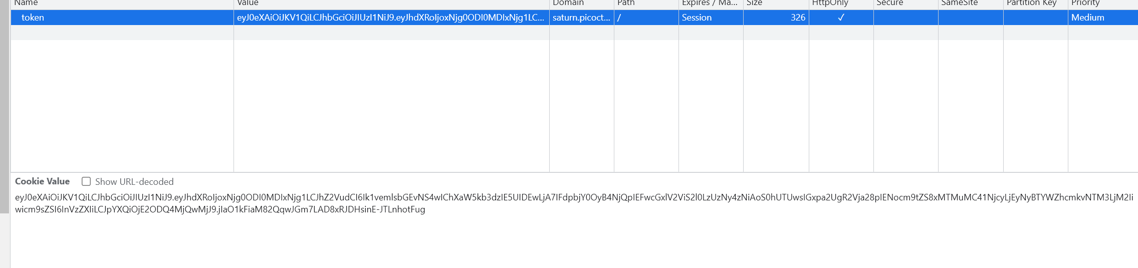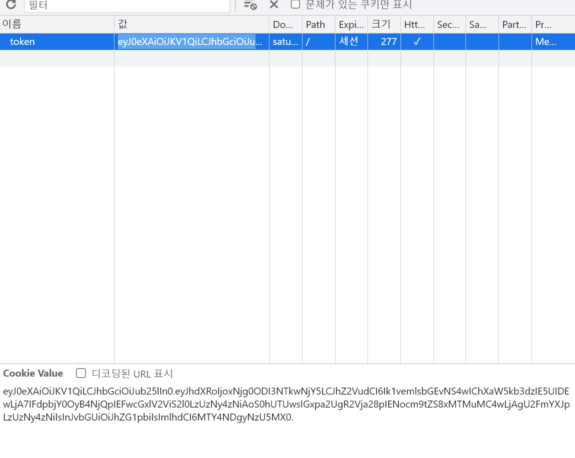 아래는 입력한 쿠키 값이다. (원래 점 두 개를 이용해서 헤더, 페이로드, 시그니쳐 세 개의 파트로 나눠지기 때문에