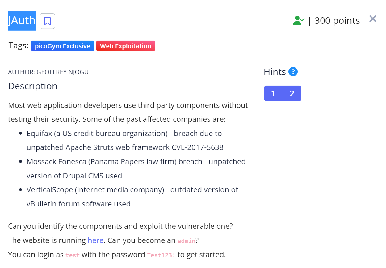 이번 문제는 설명이 긴데 그냥 다른 툴이나 그런 걸 그대로 가져다 써서 취약점이 발견되는 경우도 많고 뭐 그냥 admin으로 로그인 하라는 내용이고 test/Test123!로 임시 로그인 해볼 수 있다고 한다.
