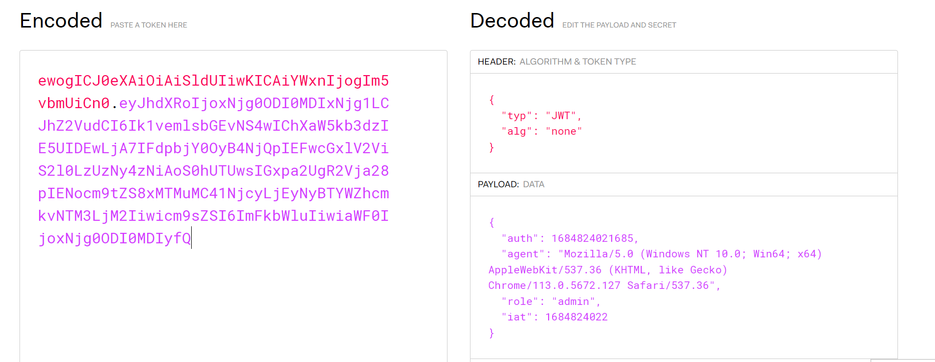 eyJ0eXAiOiJKV1QiLCJhbGciOiJub25lIn0.eyJhdXRoIjoxNjg0ODI3NTkwNjY5LCJhZ2VudCI6Ik1vemlsbGEvNS4wIChXaW5kb3dzIE5UIDEwLjA7IFdpbjY0OyB4NjQpIEFwcGxlV2ViS2l0LzUzNy4zNiAoS0hUTUwsIGxpa2UgR2Vja28pIENocm9tZS8xMTMuMC4wLjAgU2FmYXJpLzUzNy4zNiIsInJvbGUiOiJhZG1pbiIsImlhdCI6MTY4NDgyNzU5MX0.