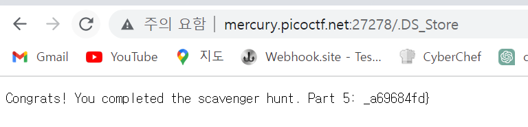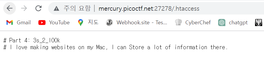 주소/.htaccess로 가보니 4번 파트를 주는데 이번엔 자기 mac에서 웹사이틀 만드는 걸 좋아한다고 하고 거기에 많은 정보를 저장했다고 한다. 맥과 store을 보니 떠오르는 게 .DS_Store이다. 한 번 접속해보자.
