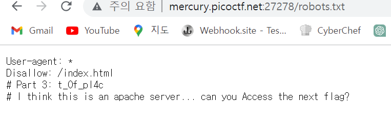 아마도 flag가 있는 곳의 힌트를 주는 것 같다. 이건 robots.txt에서 저 역할을 하기에 robots.txt로 가보자.