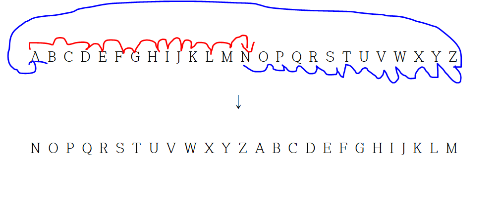 그림으로 설명하면 A는 13칸 이동해서 N자리에, N은 12칸을 이동하면 Z의 자리까지 이동하는데 이때 제일 앞자리인 A로 이동해서 숫자를 이어서 센다.