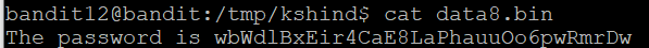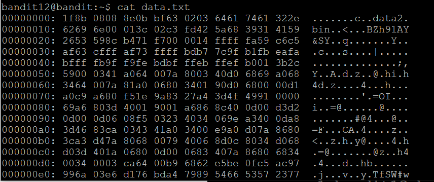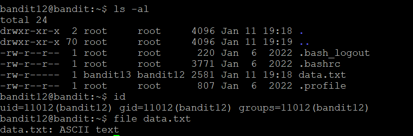 들어가 보면 우리의 유저명, 그룹명은 bandit12로 data.txt에 대해서 read만 가능하고 ASCII text 형식이다.