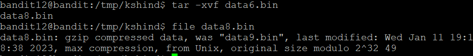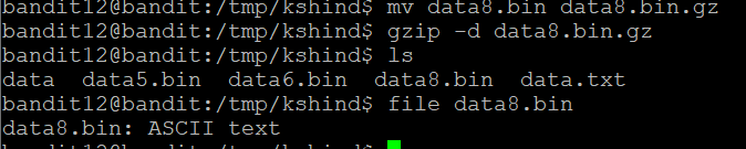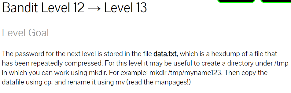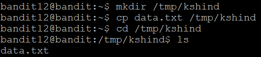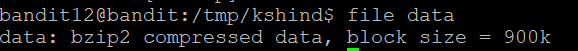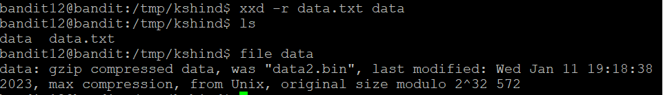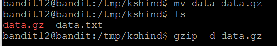 data.txt에 다음 단계로 가는 password가 있는데 반복적으로 압축된 파일의 hexdump라고 한다. 이 단계에서 mkdir을 이용해서 /tmp 아래에 디렉토리를 만드는 게 작업하는데 좋다고 합니다.