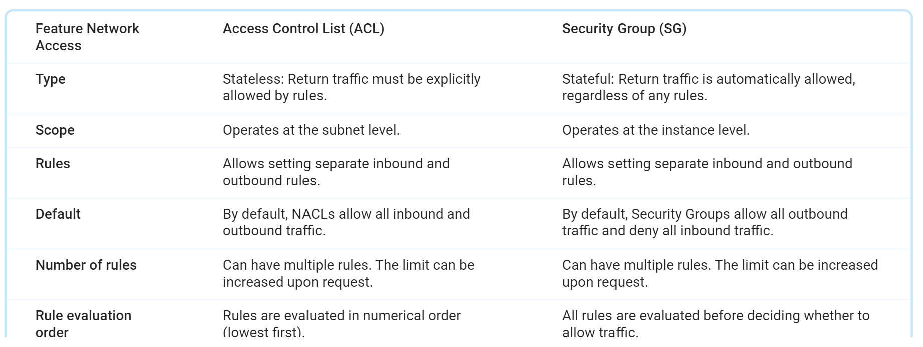 Secuurity Group과 ACL은 인스턴스와 서브넷의 인바운드와 아웃바운드의 트래픽을 제어하는 가상 방화벽의 역할을 함