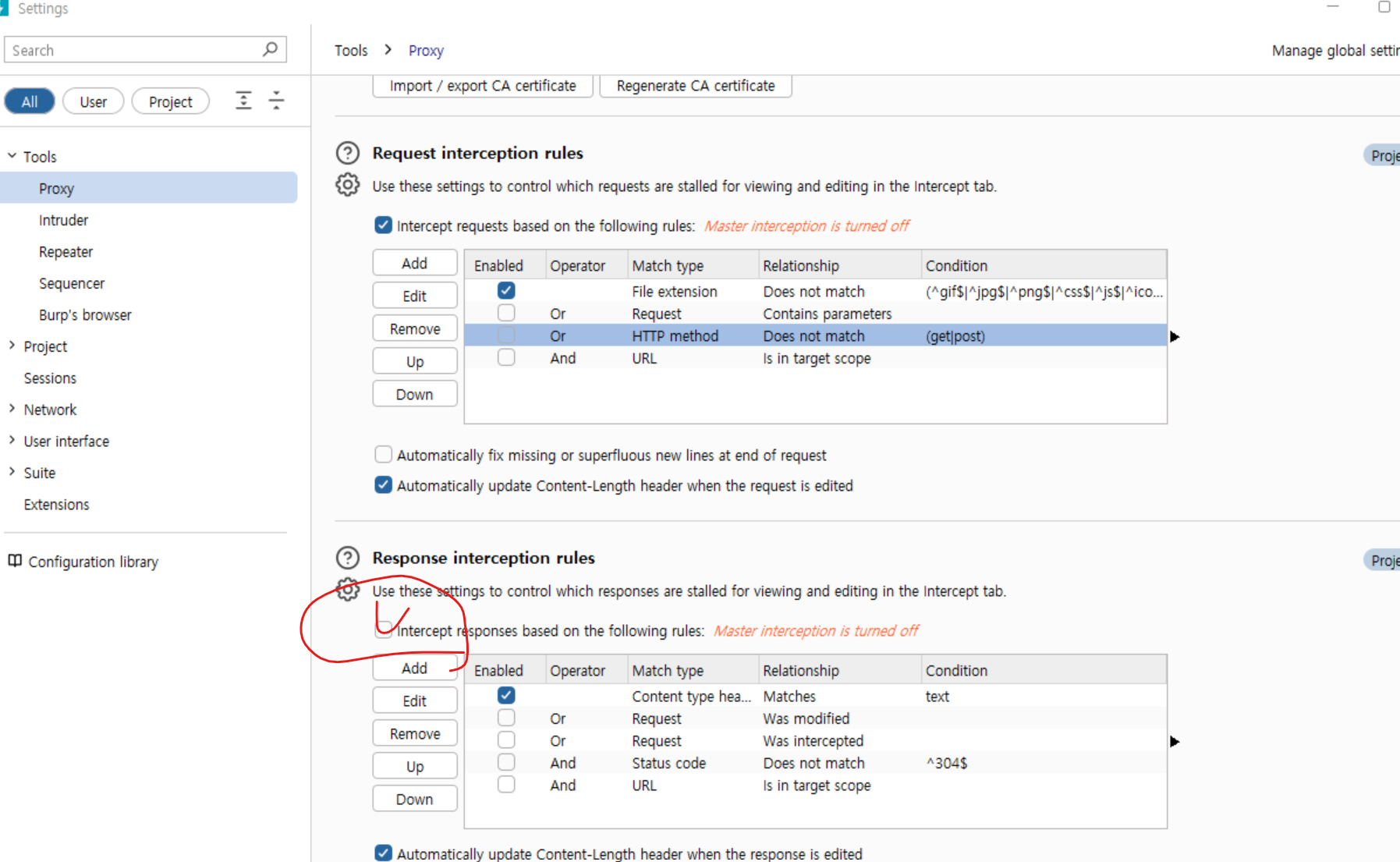 user interface에서 inspector and message editor 클릭 -> HTTP message display에서 change font 클릭 후 한글이 적혀있는 거로 변경 바탕체 14p 추천...