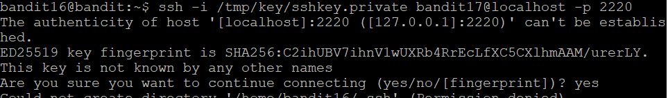ssh -i /tmp/key/sshkey.private bandit17@localhost -p 2220