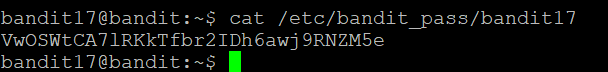 이전에 password를 얻었던 경로 그대로 bandit17을 적용해서 cat 해봤더니 password를 얻을 수 있었다.