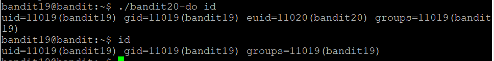 ELF 파일 실행 후 사용한 id의 출력을 보면 euid라고 붙으면서 bandit20의 권한이 들어와 있는 것을 볼 수 있다.