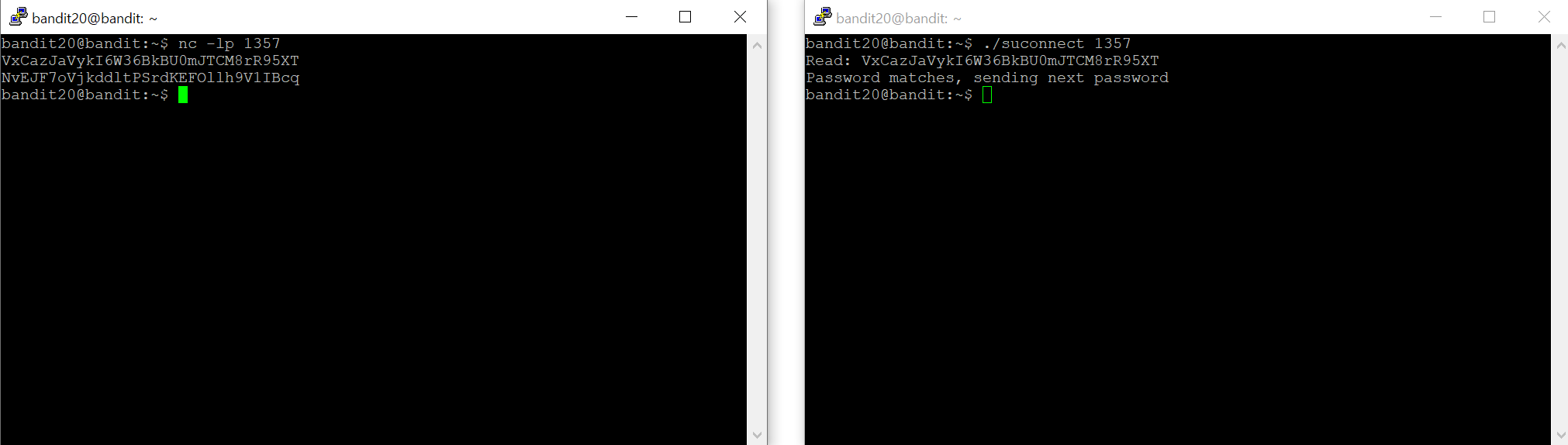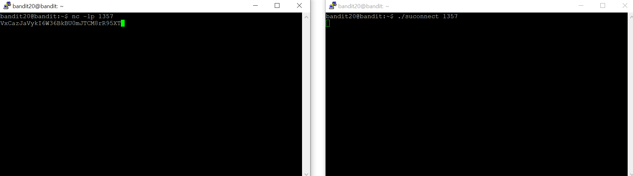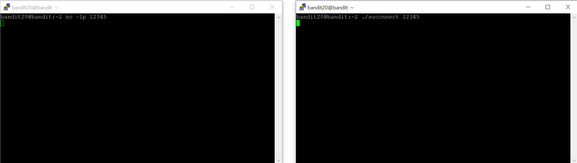 suconnect 사용법 중 포트를 open한 쪽에서 bandit20의 password를 입력하라고 했기 때문에 왼쪽에 password를 입력함