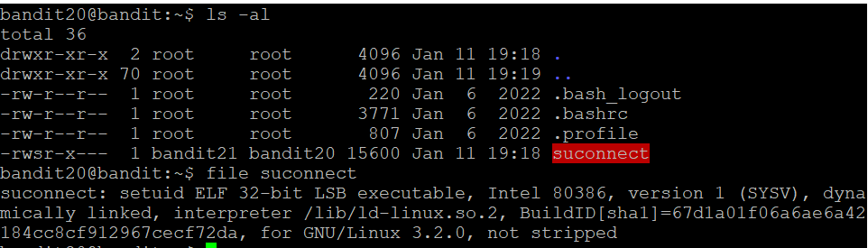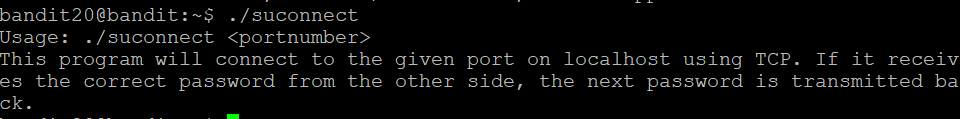 홈디렉토리에 setuid binary가 있는데 이건 커맨드라인 인자로 특정시킨 로컬호스트의 포트로 연결하게 해주는 그런 파일이라고 한다. 그리고 bandit20의 password와 비교해서 일치한다면 다음 단계로 가능 password를 전송해준다고 한다.