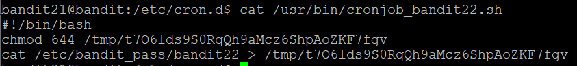 bandit22의 password를 권한을 수정한 /tmp/t7...fgv 파일에 보낸다는 내용 같아서 /tmp/t7...fgv를 읽어봐야 될 것 같다.