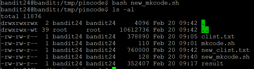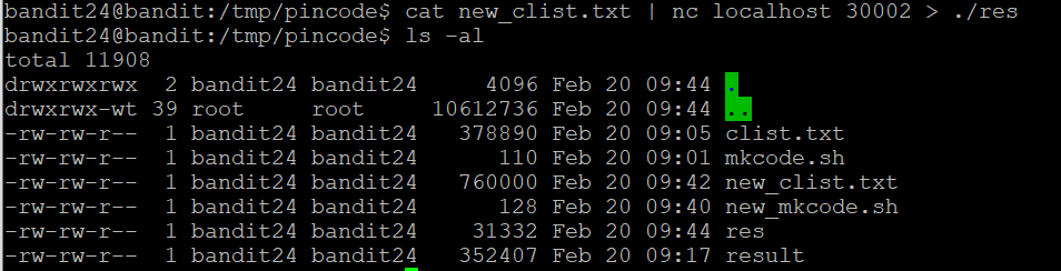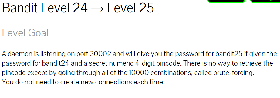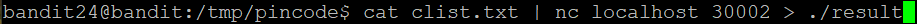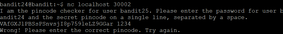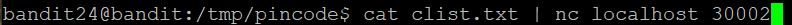 포트 30002포트로 리스닝을 하고 bandit24의 password와 4자리 암호를 주면 bandit25의 password를 준다고 하는 것 같다.