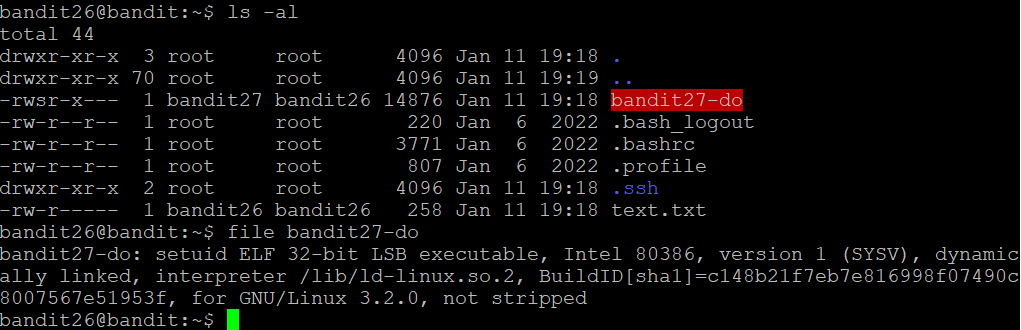 문제 bandit25에서 26으로 접속하는 건 쉽지만 bandit26의 셸은 /bin/bash가 아닌 다른 무언가라고 한다. 그게 뭔지 알아내고 어떻게 작동 발생되는지 알아내라고 하는 것 같다. 풀이 ls -al을 해보면 bandit