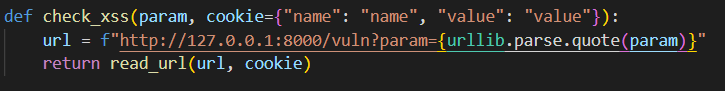 def check_xss(param, cookie={"name": "name", "value": "value"}):