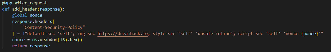 ] = f"default-src 'self'; img-src https://dreamhack.io; style-src 'self' 'unsafe-inline'; script-src 'self' 'nonce-{nonce}'"