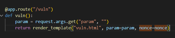 vuln엔드포인트에서 이전엔 그냥 param을 return하는 방식이었는데 이번엔 html을 render_template를 이용해서 보여주기