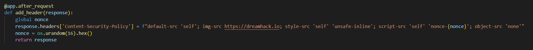 | ['Content-Security-Policy'] = f"default-src 'self'; img-src https://dreamhack.io; style-src 'self' 'unsafe-inline'; script-src 'self' 'nonce -{nonce}'; object-src 'none'" |