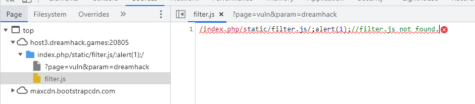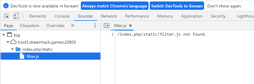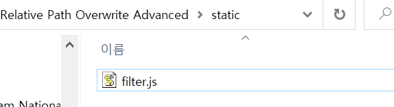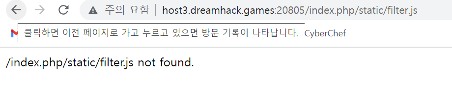 위 사진처럼 없을 것 같은 파일경로인 index.php/static/filter.js를 입력해서 주소에 입력했더니 이런 식으로