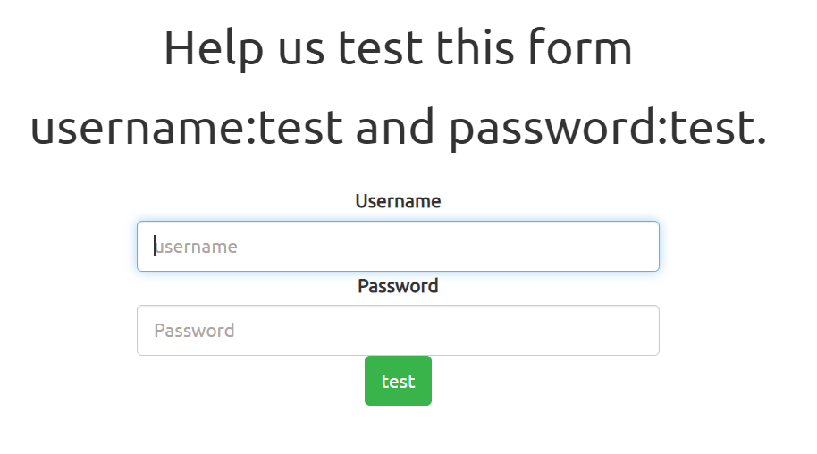 접속하면 이런 화면을 볼 수 있다. test/test!를 입력하고 test 버튼을 눌러보자.