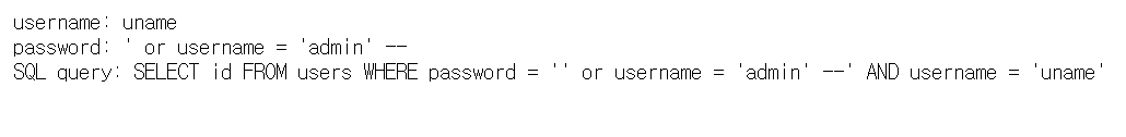 username엔 아무거나 입력하고 password에 ' or username = 'admin' --를 입력해보자.